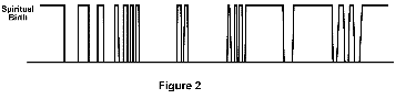 The graphic above illustrates one saved-sinner's walk with Christ. My objective in using the graphic is to make it painfully clear that what each of us must reckon with is the total loss of everything produced in the flesh. The impermanency of what our text calls "wood, hay and straw" is depicted by a dotted line. These include achievements won through what Watchman Nee calls "the latent power of the soul." They may have temporal value. One can make a pretty good living dealing in "wood, hay and straw." But the writer of Hebrews identifies them as "dead works" (Heb. 6:1; 9:14). In terms of making a life, they have no eternal value, in contrast to "gold, silver and precious stones," shown as a solid line. He is speaking metaphorically, of course, but he makes his point. Study figure 1 for a moment. Beginning at spiritual birth, and continuing until he goes to meet the Lord, the sinner-saint described above vacillates between Spirit and flesh control for varying lengths of time. Let's assume this individual is saved at age 16 and dies at 71. He or she is a Christian for fifty-five years. According to the above graphic, at least half of his or her life as a Christian is spent under the domination of the flesh, illustrated by a dotted line. Notice how, as a young person, commitment is on-again, off-again. In mid-life, spiritual warfare