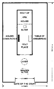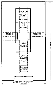 Figure 1 The most sacred area was the inner room, the Holy of Holies, beyond the separating veil. This area housed the ark of the covenant with "the cherubim of glory overshadowing the mercy seat" (9:5). Permeated with the glory of God, it was a place where only the high priest was permitted, and then just once a year on the day of atonement. The tabernacle was the earthly center of Jewish faith and worship. It was the one place where, more than any other, Jehovah was thought to dwell. The ark in the Holy of Holies was believed to be Gods home on earth. It was always kept closed. But Jehovah could be reached if anything were placed on the lid, or mercy seat, as it was called. This was as close as human gifts could get to God. Thus, the mercy seat became the place par excellence. The spot on which atonement must be made and the dark smirch of sin erased. A quick look at figure 2 (below) will show that, just inside the gate, was the brazen altar where portions of the animal sacrifice were burned. At the far end was the ark of the covenant in Gods throne room, the Holy of Holies. As the graphic indicates, the God-given arrangement of these and the other pieces of furniture, all of which were beautiful pictures of some aspect of our Lords life and person, formed the shadow of a cross.